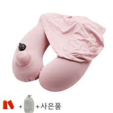 [더알파/휴대용목베게] 여행용 기내용 휴대용 에어펌프 후드 목베개 (파우치 + 이어플러그), 1개, 분홍색