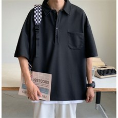 오버핏 배색 카라 버튼 W 자수 카라 반팔 티셔츠 MH2007
