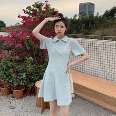 여름 한국 판 2021 허리 날씬 해 보 이 는 뽀 로 넥 소금 달콤 한 트 레이 닝 반팔 원피스