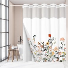 Kakurookie 후크 없는 꽃무늬 샤워 커튼 욕실용 스냅 인 패브릭 라이너 세트 다채로운 꽃 이중 레이어 방수 원단 시스루 탑 180.3x188cm71x74인치 꽃1, 플라워-1