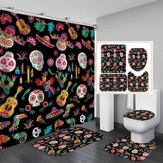 Camille&Andrew 4피스 다채로운 설탕 해골 샤워 커튼 세트 해골 꽃 선인장 앵무새 할로윈 멕시코 죽음의 날 욕실 장식 방수 원단 블랙 샤워 커튼 미끄럼 방지 욕실, 다채로운 슈가 스컬